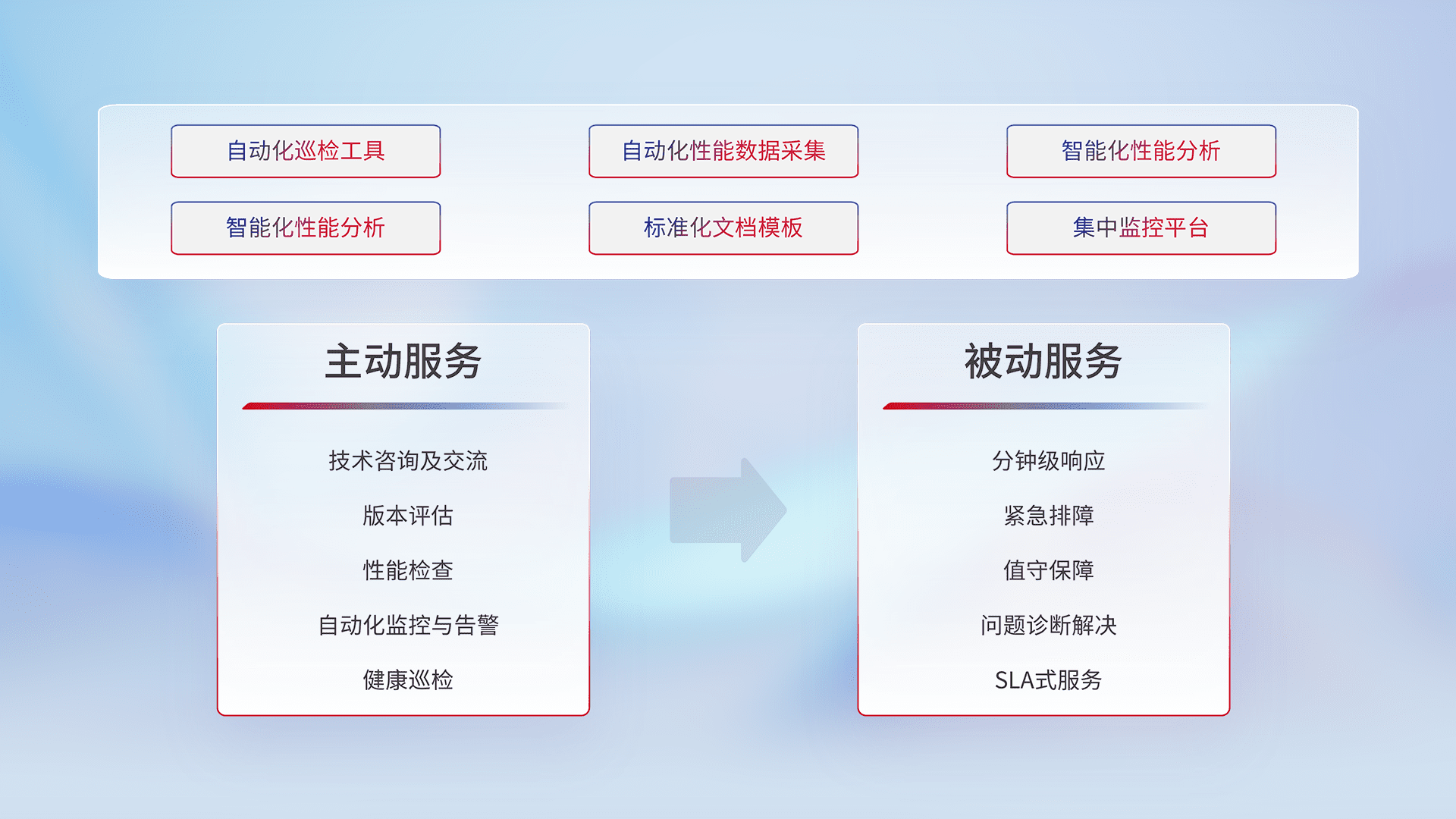 智能化工具和标准化文档,,保障服务质量,,提供主动服务(包含技术咨询、、、版本评估、、、、性能检查、、、、自动化监控与告警、、、、健康巡检)和被动服务包含(分钟级响应、、紧急排障、、、值守保障、、、、问题诊断解决、、、、SLA服务)。。